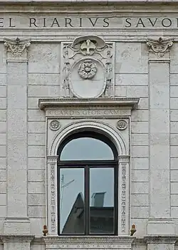 Darüber Schilde mit der heraldischen Rose der Familie Riario. Der Auftrag, diese Fensterädikulä herzustellen, erging nachweislich an Andrea Bregno.[12] Die Inschrift im Band über der Fensterreihe des Piano nobile erinnert an den Erbauer und an das Datum der Fertigstellung 1495 unter Papst Alexander VI.