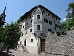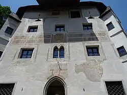 Der wuchtige vierstöckige, fast kubische Bau besitzt an den Seiten zwei Erker. Die Außenfassade ist u. a. mit Wappenfresken und einer Sonnenuhr verziert. An dem Gebäude schließt seitlich eine Steinmauer mit Zinnen an.