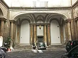 Gioffredo wurde auch durch die Bedenken von Vanvitelli bezüglich der Ausführung des Gebäudes behindert, der einige strukturelle Mängel bei den Arbeiten feststellte, die Schäden am Gebäude verursachten. So begann Vanvitelli 1766 mit der Renovierung des Palastes: Er arbeitete vor allem im elliptisch angelegten Innenhof, in dem er einen Portikus mit vier Bögen errichtete, der von acht Piperno-Säulen getragen wird. Die Säulen stammten aus der frühchristlichen Kirche Santa Maria della Rotonda, die bei den Ausgrabungen gefunden und 1770 abgerissen worden war.