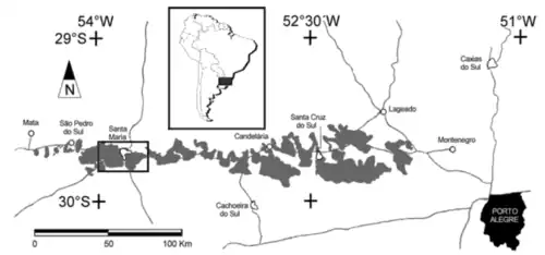 Die Fundstellen befinden sich im Norden der Stadt. In Agudo, unweit von Cachoeira do Sul, gelang der ULBRA der Fund von den versteinerten Überresten eines Sacisaurus. | |