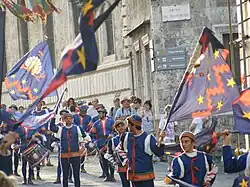 | Die Contrade des Stachelschweins (ital.: Contrada Sovrana dell'Istrice) | Die Contrade des Turms (ital.: Contrada della Torre) | Die Contrade der Welle (ital.: Capitana Contrada dell’Onda) |