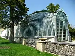 Die Gusseisen-Glas-Konstruktion mit einer Länge von 90 m ist unterkellert. Der Keller hat Lichtschächte und dient zum Überwintern von Pflanzen, die im Sommer das Gartenparterre zieren. Der Hauptsaal im Erdgeschoss ist dreischiffig. Die beiden die Schiffe trennenden Arkaden werden von 22 Säulen in der Form von Bambusstangen gebildet. Sie bestehen aus einem Eisenkern mit einer Gusseisen-Ummantelung.[1]