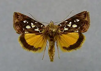 Die Flügelspannweite der Falter beträgt 29 bis 37 Millimeter.[1] Sie zählen damit zu den kleineren Plusiinae-Arten. Die Vorderflügeloberseite hat eine kastanienbraune Grundfarbe. In der etwas dunkleren Diskalregion befinden sich mehrere große, auffällige, metallisch glänzende silberweiße Flecke. Am Vorderrand sind zwei weitere, kleinere, gleichfarbige, sichelförmige Flecke zu erkennen. Unterhalb des Apex heben sich zwei bis drei große schwarzbraune Pfeilflecke hervor. Die Hinterflügeloberseite ist kräftig gelb bis gelb orange gefärbt. Die Submarginalregion ist durch eine breite schwarze Binde ausgefüllt.