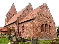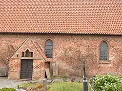 Die Schallöffnungen des fensterlosen Turms haben Korbbögen. Die Traufe des Turms liegt nur wenig oberhalb des Firstes des Schiffs. Dieser wurde bei der letzten Renovierung der Kirche erhöht, die dadurch erforderliche Erhöhung des Ostgiebels (oberhalb des Choranschlusses) mit gerautem Backstein vorgenommen.
