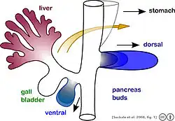 Die rückenseitige (dorsale) Pankreasanlage ist die größere und bildet den Hauptteil der späteren Bauchspeicheldrüse. Ihr Ausführungsgang ist der zusätzliche Bauchspeicheldrüsengang (Ductus pancreaticus accessorius). Die kleinere bauchseitige (ventrale) Pankreasanlage ist zunächst paarig. Bei Säugetieren vereinigen sich während der Embryonalentwicklung beide ventralen Sprosse und bilden den Bauchspeicheldrüsengang (Ductus pancreaticus). Bei Vögeln bleiben beide Sprosse der ventralen Anlage dagegen zeitlebens getrennt.[18] Aus der ventralen Pankreasanlage entsteht der Processus uncinatus („Hakenfortsatz“) und der untere Anteil des Kopfes der Bauchspeicheldrüse.[17]