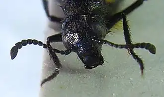 Der breite Kopf ist hinten abrupt eingeschnürt und durch einen schmalen Hals mit dem Halsschild verbunden. Dieser ist wenig schmäler als der Kopf und deutlich schmäler als die Flügeldecken. Er ist parallel, in der Mitte am breitesten. Der Clypeus ist von der Stirn durch eine deutliche Naht begrenzt (Bild 1). Die kurzen Fühler sind elfgliedrig und schnurförmig. Sie sind am Vorderrand der Augen in deren schwacher Ausrandung eingefügt. Alle Fühlerglieder sind deutlich gegeneinander abgesetzt, sie nehmen allmählich an Länge und Dicke zu. Auch das vorletzte Fühlerglied ist länger als breit, das letzte ist kegelförmig zugespitzt, bei den Männchen doppelt so lang wie breit, bei den Weibchen etwas kürzer.