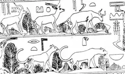 - ↑ a b c Elmar Edel: Zu den Inschriften auf den Jahreszeitenreliefs der „Weltkammer“ aus dem Sonnenheiligtum des Niuserre. In: Nachrichten der Akademie der Wissenschaften in Göttingen. Nr. 8, Vandenhoeck & Ruprecht, Göttingen 1961, S. 244.