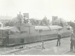 | Der Panzertriebwagen hinter einer Dampflokomotive 1918 | |