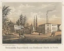 Im Jahre 1834 stieg Ferdinand Traugott Flinsch als Teilhaber in die Firma ein. Er erwarb am 30. Juni 1836 von Gustav Franz Käferstein für 14.000 Taler die gesamte Papiermühle. Danach formte er die Mühle zu einer Fabrik um. Wurde das Papier bisher von Hand geschöpft, konnte es jetzt als Endlosband produziert werden. Im Jahre 1838 wurde die erste Langsiebpapiermaschine der Firma Bryan Donkin aus England aufgebaut.[4] Im Jahre 1847 stattete die Fabrik die Stadt Penig mit Öllampen aus. Etwa 300 Arbeiter waren 1848 in der Fabrik beschäftigt.