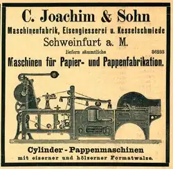- ↑ Preisverzeichnis über Papier- und Pappen- und Holzstoff-Fabrikations-Maschinen etc. der Maschinfabrik, Eisengießerei & Kesselschmiede C. Joachim&Sohn Schweinfurt a. Main. 1. Januar 1900, S. 31.