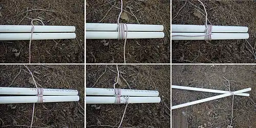 Zuerst befestigt ein Zimmermannsschlag oder Webeleinenstek die Leine an einem der Stäbe. Dann werden einige Windungen um beide Stäbe gewickelt und anschließend einige weitere Windungen um die zwischen den Stäben verlaufenden Abschnitte der Leine. Schließlich fixiert man die Leine wieder mittels Webeleinenstek an einer der Stäbe.