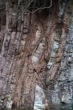 Im Zuge der Gebirgsbildung wurden die Gesteinsschichten in diesem Gebiet nach Südwesten geneigt.[5]:188