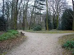 Die Bäume verteilen sich auf vier Waldparzellen, die den Park einrahmen, Rotbuchen im Nordwesten, Kiefern im Südwesten, Scheinakazien, Pappeln und Linden im Südosten und Osten sowie Eichen, Hainbuchen und Eschen im Nordosten und Osten. Durch den Park führen drei Baumalleen, eine Lindenallee vom Norden zum Schloss, eine weitere jüngere Lindenallee von Nord nach Süd, und eine Lebensbaumallee von West nach Ost.