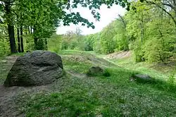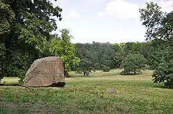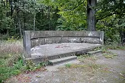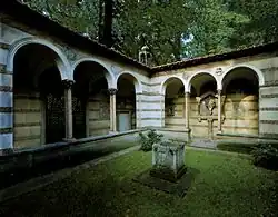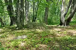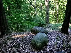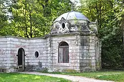 In gewisser Weise aber hing das Herz des Prinzen an Glienicke, denn dort hatte er anlässlich des Todes seines Sohnes Prinz Friedrich Karl jun., der 1917 im Krieg gefallen war, eine Familiengrabstätte anlegen lassen. Als Platz hatte er die Höhe über dem Großen Wiesengrund, westlich der Römischen Bank gewählt. Es wurde eine kreisrunde Senke ausgehoben, in der die Gräber radial entlang der Futtermauern angeordnet wurden. Prinz Friedrich Leopold fand hier 1931 die letzte Ruhestätte, seine von ihm vollkommen entfremdete Gattin Louise Sophie von Schleswig-Holstein-Sonderburg-Augustenburg († 1952) lehnte es ab, neben ihm beigesetzt zu werden. Die noch heute belegte Begräbnisstätte beeinträchtigt in ihrer Schlichtheit nicht den historischen Park, hat ihn aber auch nicht bereichert.[25]
