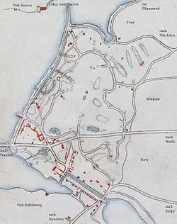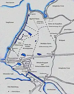 - ↑ vgl. Seilers parzellengenaue Parkentwicklungskarte im Katalog Schloss Glienicke, 1987, S. 137.