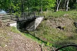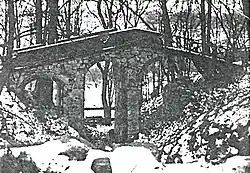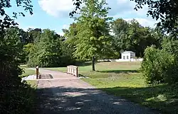 - ↑ Bernhard: Die Bautätigkeit … in: Ausstellungskatalog Schloß Glienicke 1987, S. 87. Sievers: Bauten für den Prinzen Karl. 1942, S. 142. bildet die Anlage noch mit dem eigentlichen Tor und Staketenzaun ab. Auf dieser Aufnahme von 1934 ist die Chaussee noch nicht abgegraben und die Anlage steht entsprechend noch direkt an der Straße.