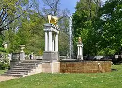 - ↑ Harry Nehls: Italien in der Mark. 1987, S. 44 (Anm. 183): „Die Kanonen wurden nicht, wie Sievers angibt, an die Franzosen ausgeliefert, sondern befinden sich noch immer im Glienicker Park, vergraben unter der von den Nationalsozialisten errichteten ‚bombastischen Terrasse‘. Eine ‚Exhumierung‘ ist zur Zeit nicht vorgesehen, vermutlich weil die Kanonen dann gen ‚Osten‘ gerichtet wären. Denkmalpflege sollte hier jedoch vor fragwürdigen politischen Ressentiments stehen, denn abgesehen von ihrem trophäenhaften Charakter dienten sie hier im Glienicker Park in ihrer neuen Bestimmung schließlich nicht mehr als Angriffswaffen. Traditionelle Salutschüsse, auch in unserem demokratischen Zeitalter, hat bisher noch niemand abschaffen wollen.“