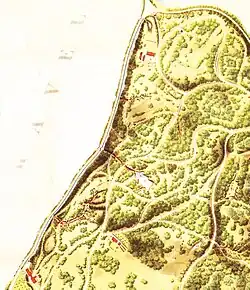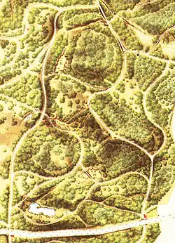 3a. Ausschnitt Neuvermessung 1845, gerade Linien=Wasserleitung, Punkte=Baumstämme, Wolken=Büsche (Gustav Meyer, 1845) -