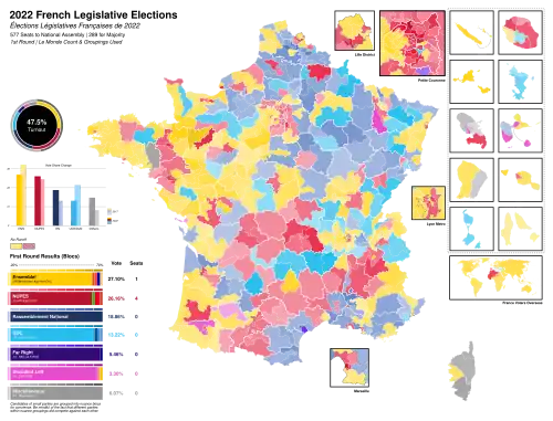 Die Wahl endete mit starken Verlusten für den Staatspräsident Macron stützenden Parteienblock und war die erste seit der Parlamentswahl 1997, in der die Partei des Präsidenten zusammen mit ihren Verbündeten nicht die absolute Mehrheit der Sitze erhielt.