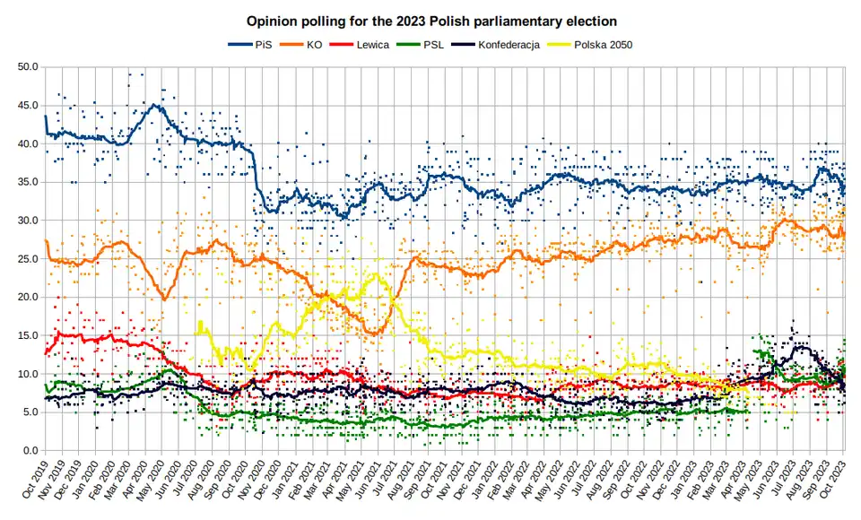 - ↑ Parlamentswahl in Polen: Verliert die PiS-Partei die Macht? 16. Oktober 2023, abgerufen am 16. Oktober 2023.