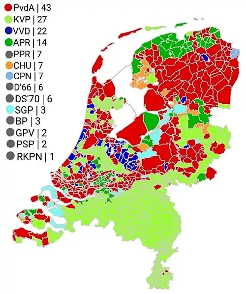 | Katholieke Volkspartij (KVP) | 1.305.401 | 17,7 | 27 | –8 | |