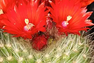 Die orangegelben bis roten Blüten erreichen Längen von bis zu 5 Zentimeter und Durchmesser von 4 Zentimeter. Ihr Perikarpell und die Blütenröhre sind mit weißer Wolle sowie ein bis zwei braunen Borsten, die aus jeder Schuppenachsel entspringen, bedeckt. Die Narben sind hellgelb. Die dünnwandigen, länglichen, anfangs rötlichen Früchte werden bei Reife olivbraun. Sie weisen Durchmesser von bis zu 7 Millimeter auf. Die Früchte enthalten glänzend dunkelbraune Samen von 0,6 Millimeter Durchmesser.