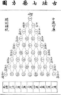 Die früheste chinesische Darstellung eines mit dem pascalschen Dreieck identischen arithmetischen Dreiecks findet sich in Yang Huis Buch Xiangjie Jiuzhang Suanfa von 1261, das ausschnittsweise in der Yongle-Enzyklopädie erhalten geblieben ist.[1] Yang schreibt darin, das Dreieck von Jia Xian (um 1050) und dessen li cheng shi shuo („Ermittlung von Koeffizienten mittels Diagramm“) genannter Methode zur Berechnung von Quadrat- und Kubikwurzeln übernommen zu haben.[2][3]