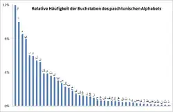 Im Jahr 2007 wurde unter Federführung des afghanischen Kommunikationsministeriums erstmals eine Häufigkeitsanalyse der Buchstaben des paschtunischen Alphabets durchgeführt. Die Genauigkeit der Ergebnisse wurde allerdings beschränkt durch die uneinheitlichen Schreibweisen einzelner Buchstaben sowie den begrenzten und unausgewogenen zur Verfügung stehenden Textkorpus. Der am meisten verwendete Buchstabe des paschtunischen Alphabets ist demnach mit einer relativen Häufigkeit von etwa 12 % das Wāw, gefolgt vom Alif mit etwa 10 %, dem unbehauchte He mit 8,5 % und der arabischen Form des Je mit knapp 8 % relativer Häufigkeit. Fasst man allerdings alle fünf Varianten des Je zusammen, so stellt dieses mit 16,5 % das am häufigsten benutzte Schriftzeichen dar. Mit gut 1 % relativer Häufigkeit ist der meistverwendete rein paschtunische Buchstabe das retroflexe Rre.[20]