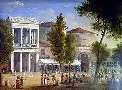 Links das Théâtre des Variétés und rechts die beiden Rotunden von James W. Thayer mit dem Eingang zur Passage. -