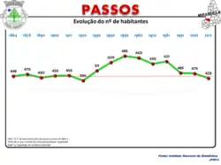 1530 war Passos als Gemeinde mit 66 Einwohnern im Kreis Lamas de Orelhão verzeichnet. 1706 hatte die Gemeinde 80 Einwohner, 1796 waren es bereits 327. Im Jahr 1864 erreichte die Gemeinde eine Einwohnerzahl von 448, die bis auf 685 zu ihrem Höhepunkt 1950 anstieg. Seither ging die Zahl stetig zurück und lang 2011 noch bei 423.[5]