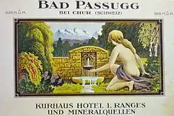 Die Heilquellen von Passugg wurden 1863 durch den Churer Sattlermeister Ulrich Sprecher wiederentdeckt. Das 1883 erbaute Kurhaus wurde wegen des grossen Andrangs zwei Mal umfangreich renoviert (Lift, elektrische Beleuchtung, Toiletten mit Wasserspülung). 1910 verfügte das Kurhaus über 220 Betten. Ein Weg führte hinunter in die Schlucht zum Quellengebäude mit Trinkhalle.[4] Die verschiedenen Quellen erlaubten je nach Zusammensetzung des Wassers verschiedene Kuren.[5]