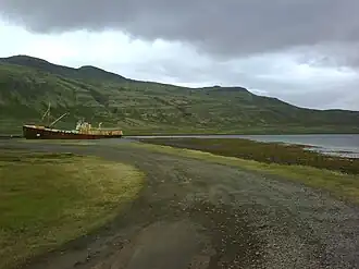 Im inneren Ende des Patreksfjörðurs hat man die Garðar BA 64, das erste Stahlschiff Islands,[1] auf Grund gesetzt und lässt es dort langsam zerfallen.