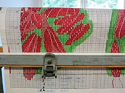 Das zum Zeichnen von Textilmustern beim Weben verwendete Papier mit in der Regel quadratischen Kästchen wird als Patronenpapier (engl. design paper; point paper) bezeichnet.[1][2] Die Abstände zwischen den Linien sind größer als beim Millimeterpapier, so dass der Textilmusterzeichner (Dessinateur) die Kästchen bequem ausfüllen, d. h. die Bindungs-Stellen, bei denen der Kett- über dem Schussfaden zu liegen hat, markieren und vom Weber erkannt werden kann.