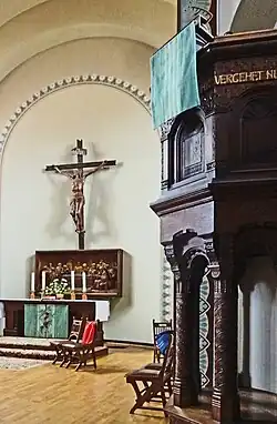 Kunstvoller Mittelpunkt der Kirche ist das Schnitzbild Heiliges Abendmahl, das Joh. 13,34 gewidmet ist. Es stammt wie der Altar und die Kanzel von Leipzigs Holzbildhauer Heinrich Behr. Er orientierte sich an byzantinischen Vorbildern und an einem gemäßigten Jugendstil. Das Abendmahls-Relief entstand 1893 und war zuvor auf der Weltausstellung in Chicago zu sehen, dort erhielt es in der Abteilung Deutsche Kunst den Kunstpreis.
