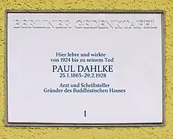 Die verbleibenden Jahre bis zu seinem Tod waren ausgefüllt von der täglichen Gemeinschaft im Haus und einer regen Vortrags-, Reise- und Publikationstätigkeit für die buddhistische Sache, wofür er konkurrierende Interessen an Mathematik und Musik nun vollends aufgab. Im Winter 1927/28 bekam Dahlke die Grippe, von der er sich, auch aufgrund einer in Java zugezogenen Herzschwächung durch ein tropisches Fieber, nicht wieder erholte. Dahlke erlag seiner Herzschwäche am 29. Februar 1928, einem Vollmondtag, und wurde auf seinem eigenen Grundstück begraben. Nach seinem Tod übernahm seine Schwester Bertha Dahlke die Leitung des Buddhistischen Hauses. Der Philosoph Volker Zotz prägte für die Interpretationen des Buddhismus durch Paul Dahlke und Georg Grimm den Begriff „deutsche Buddhologie“ und wertete sie als „eigenständige Interpretationsschulen des Buddhismus.“[1]