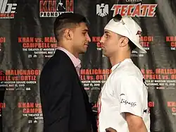 ![]() Paul Malignaggi (rechts) im Staredown mit Amir Khan (2010)