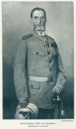 Durch Kabinettsorder vom 22. März 1902 wurde Hoepfner aus der Marine verabschiedet und als Kommandant von Berlin wieder in der Preußischen Armee angestellt. In dieser Eigenschaft erhielt er die Erlaubnis zur Annahme des Großoffizierkreuzes des Ordens der Krone von Italien, des Persischen Löwen- und Sonnenordens, des belgischen Leopoldsordens sowie des dänischen Dannebrogordens, außerdem des Albrechts-Ordens und des Greifenordens.[3][4] Hoepfner stieg Ende April 1904 zum Generalleutnant auf und fungierte ab dem 31. Mai 1904 als Inspekteur der Landwehr-Inspektion Berlin. Am 27. Januar 1908 erhielt er den Charakter als General der Infanterie und wurde am 18. Februar 1908 unter Belassung in seinem Dienstverhältnis à la suite des II. See-Bataillons gestellt. Unter weiterer Belassung à la suite des II. See-Bataillons wurde Hoepfner am 13. September 1912 von seiner Stellung enthoben und in Genehmigung seines Abschiedsgesuches mit der gesetzlichen Pension zur Disposition gestellt.