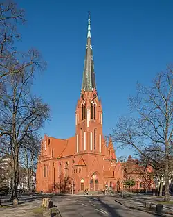 Der Mauerwerksbau ist mit roten Ziegeln verblendet. Die Giebel werden durch Radfenster, Maßwerkblenden, Krabben und Fialen betont. Als Haupteingang dient ein spitzbogiges Trichterportal, bekrönt mit einem Wimperg. Der Turm hat ein spitzes oktogonales Zeltdach. Die großen mit Wimperg abgeschlossenen Schallarkaden werden von Türmchen flankiert.
