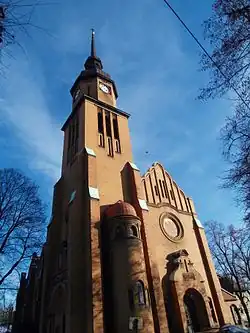 Die als Zitate den Paulusbriefen entnommenen, von den Ullersdorfer Werken in Terrakotta hergestellten Inschriften über dem Haupteingang besagen: Kämpfe den guten Kampf des Glaubens 1 Tim 6,12 und über dem seitlichen Eingang: Nun aber bleibet Glaube, Hoffnung, Liebe 1 Kor 13,31 , darüber sind die entsprechenden die Symbole Kreuz, Anker und Herz angebracht. Diese Elemente waren ursprünglich vergoldet. An der Nord- und Südseite der Fassade finden sich weiterhin Symbole von am Bau der Kirche beteiligten Gewerken. An der Ostseite finden sich die Jahreszahlen 1899 und 1901, die auf Beginn und Abschluss des Baus hindeuten.