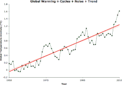 - ↑ "Despite the robust multi-decadal warming, there exists substantial interannual to decadal variability in the rate of warming, with several periods exhibiting weaker trends (including the warming hiatus since 1998) … Fifteen-year-long hiatus periods are common in both the observed and CMIP5 historical GMST time series", "Box TS.3: Climate Models and the Hiatus in Global Mean Surface Warming of the Past 15 Years", IPCC, Climate Change 2013: Technical Summary, p. 37 and pp. 61–63.