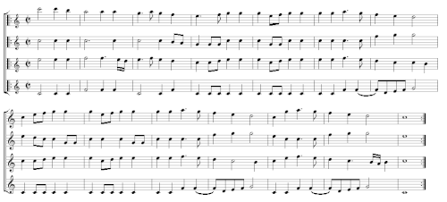Die meisten Pavanen sind dreiteilig, wobei jeder Teil wiederholt wird: A–A′–B–B′–C–C′.