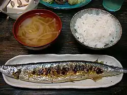 - b)Japanische Hausmannskost mit Fisch – hier angebratenen pazifischen Makrelenhecht, Sanma – 秋刀魚, Gemüse, Tofu, Reis und Misosuppe als typisches Abendessen.