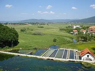 ![]() Pećina-Quelle, Blick über den Teich und die Fischfarm auf den Verlauf des Flüsschens Kostelka | |