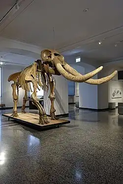 Das bekannteste prähistorische Fossil, das im frühen 19. Jahrhundert in den Vereinigten Staaten ausgegraben und rekonstruiert wurde, ist Charles Willson Peale’s Mastodon. Es handelt sich um das nahezu vollständige Skelett eines amerikanischen Mastodons (Mammut americanum), das 1801 in Newburgh im Bundesstaat New York entdeckt wurde.[2] Das Mammut americanum lebte vor etwa fünf Millionen bis vor 11.000 Jahren in den offenen Wäldern Nordamerikas, unter anderem in Kanada, den USA und Mexiko. Fossilfunde, darunter vollständige Skelette und Mageninhalte, belegen, dass es sich von den Zweigen von Koniferen wie Tanne und Lärche und Laubbäumen wie Pappel und Weide ernährte.