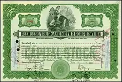 - ↑ Abbildung einer Aktie mit der Firmierung Peerless Motor Car Corporation (englisch, abgerufen am 18. November 2018)