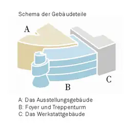 Der Neubau entstand auf einer Grundfläche von wenig mehr als 2000 m² und besteht aus drei Teilen mit unterschiedlichen Funktionen. Diese Bauteile sind durch mehrere Übergänge auf verschiedenen Ebenen miteinander verbunden. Die Geometrie des Grundrisses besteht aus einfachen Formen: Dreieck (der eigentliche Ausstellungstrakt), Kreisbogen (die Fassadenlinie des Foyers) und Rechteck (die Flügel des Werkstattgebäudes). Das Dreieck wird im ganzen Gebäude als wiederkehrendes Formelement verwendet, ähnlich wie in zwei berühmten früheren Gebäuden Peis, dem Ostflügel der National Gallery in Washington, D.C. und dem Bank of China Tower in Hongkong.