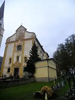 Als Stammvater des Familienzweiges in Innichen gilt der begüterte Gastwirt Jakob Peintner d. Ä., vermutlich der älteste Sohn von Christian Peintner d. Ä. Er hatte 1659 das Gasthaus „Grauer Bär“ in Innichen von seinem Schwager, dessen Familie es seit Mitte des 16. Jahrhunderts besaß, erworben. Es galt zu seiner Zeit als das vornehmste Wirtshaus im Pustertal.[9] Seine Söhne aus zweiter Ehe Johann und Joseph Peintner führten zudem das Gasthaus zum „schwarzen Adler“. Joseph bekleidete später in Innichen das Amt des Kapitelamtmann beim örtlichen Chorherrenstift. Am 26. März 1698 wurde ein anderer Sohn Jakob Peintner d. J., seit 1677 Regierungssekretär in Innsbruck, mit dem Prädikat „von Peintner“ in den Adelsstand erhoben.[10] Sein Schwiegersohn Christoph Jakob von Hafner, Stadtsyndicus von Meran, erhielt 1741 zusätzlich das Prädikat „zu Puechenegg und Peintner“ sowie die Bewilligung, Namen und Wappen des ausgestorbenen Geschlechts seines Schwiegervaters mit seinem eigenen zu vereinigen.[11] Am 5. Juli 1742 wurde Joseph Anton Peintner, Schützenhauptmann und Urbaramtmann in Innichen, in anderen Quellen auch Anton Josef Franz Peintner genannt, womöglich Sohn von Joseph Peintner, mit dem Prädikat „von Peintner zu Sternfeld“[12] von Kaiserin Maria Theresia in den Reichsritterstand erhoben. Aus diesem Anlass wurde sein Familienwappen in einigen Punkten abgeändert. Sein Grabstein befindet sich am Eingang zum Hauptschiff der Stiftskirche von Innichen.