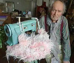 Ursula Schultze-Bluhm (1921–1999), Künstlername Ursula, beschäftigte sich als Autodidaktin mit ihren der Volkskunst ähnlichen Arbeiten als Erste in größerem Umfang als andere Künstler mit dem Material Pelz.[26] Seit 1951 fuhr sie regelmäßig nach Paris, wo sie 1954 von Jean Dubuffet für sein Musée de l'Art Brut entdeckt wurde. Art brut definierte man zu der Zeit noch als „die autodidaktische Kunst von Laien, Kindern und Geisteskranken“, später wurde Ursula Schultze-Bluhm, zusammen mit ihrem Mann Bernard Schultze, anspruchsvoller unter dem Stichwort „Phantastische Figuration“ eingeordnet.[27] Zusammen mit Bernard Schultze hatte sie Anfang 1974 im Rotterdamer Museum Museum Boijmans Van Beuningen eine Ausstellung mit dem Untertitel „Träume in Pelzen und Farben“.[28] Über die Herkunft der von ihr während ihrer Laufbahn verarbeiteten Felle und Pelze scheint wenig publiziert zu sein. Ein Farbstiftbild aus dem Jahr 1965, allerdings ohne von Verwendung realem Pelz, trägt den, im Original englischen Titel „Der alte Pelz meines alten Schwiegervaters des Geistes von N.Y.“ (Museum Morsbroich, Leverkusen).[29]