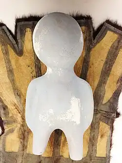 - Der Stamm der mit vielen Fundstücken versehenen Saugerstele ist nicht fellbezogen. Die Augen sind aus räderartigen Holzteilen, darunter Kastagnetten als Tränen. Die Brüste sind Gummi-Abflusssauger, in passender Höhe ist ein Dessoushöschen angebracht, direkt darüber hängt ein Monokel. Für die Kopfhaare wurden Waschbärfelle mit den daran hängenden Schwänzen verwendet.