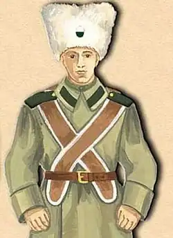 Im Heer der jungen Sowjetunion blieb die Lammmütze auf das Kosakenheer beschränkt, wo sie zu der sich aus dem nationalen Kostüm entwickelten Uniform gehörte. Bereits im 18. Jahrhundert trugen die Kosaken hohe, zylindrische Mützen aus grauem Lammfell mit einem farbigen Tuchbeutel oder hohe Tuchmützen mit Fellkrempe. Es änderten sich immer wieder Form und Farbe, jedoch wurden sie nie von der reinen Tuchmütze verdrängt.[36]